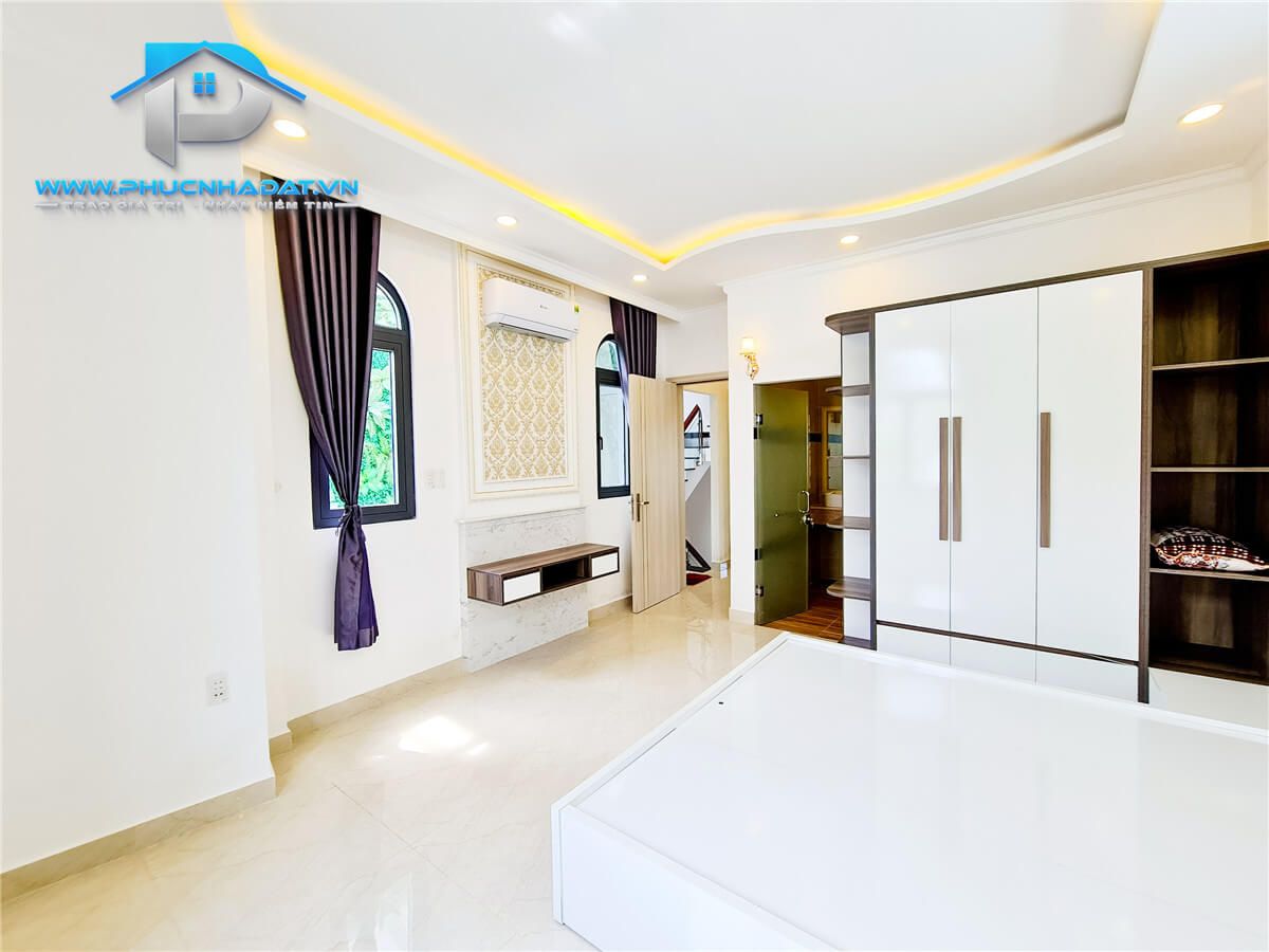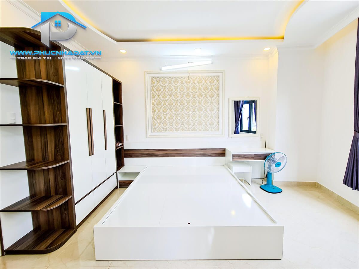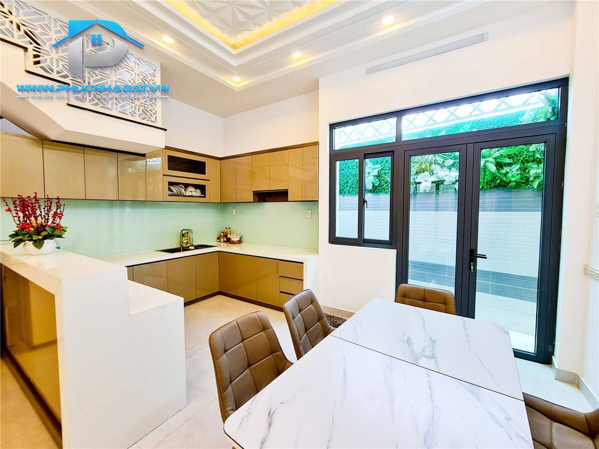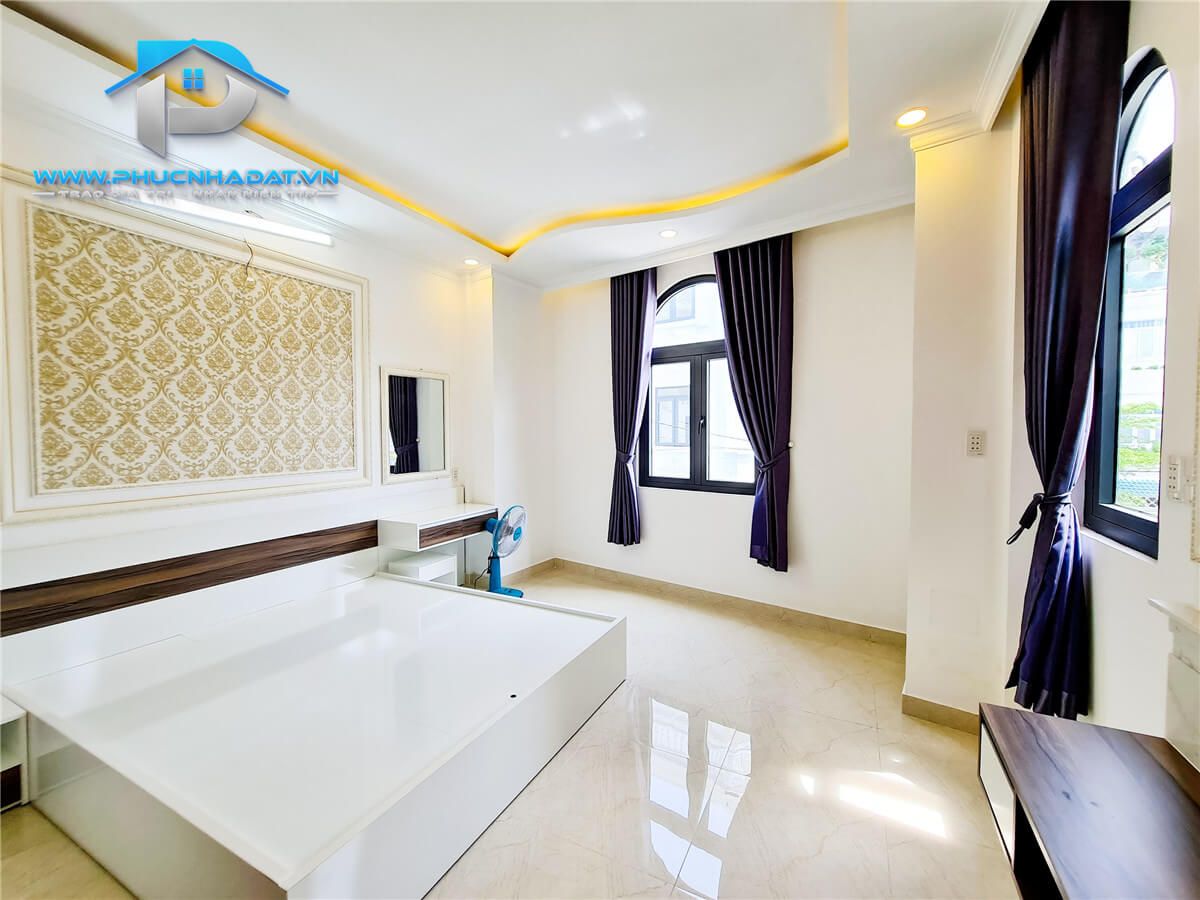 – Kết Cấu : diện tích 6x14m 1 trệt 2 lầu sân thượng chuồng cu , 4 phòng full nội thất, phòng thờ + phòng giặt, 5 toilets . Sân xung quanh nhà thoáng mát, đậu xe hơi. Sân thượng rộng rãi phù hợp trồng cây xanh, làm sân vườn. Nhà trang bị nội thất gỗ full các phòng , tủ bếp An Cường ,... xách vali vào ở ngay.